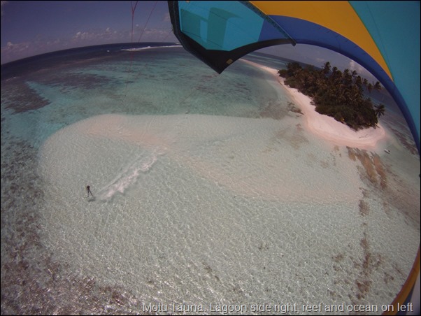 In addition to ridiculously blue water, it has an incredibly long sand spit off the south side which is where we spent our time kiteboarding. Flat water just downwind of the sandspit, the safety of kiting upwind of the sandspit as we were teaching friends to kite, unobstructed wind S of the motu. Lovely.